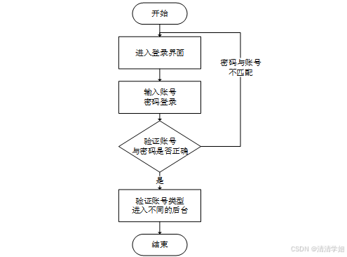 系统登录流程,通过输入账号、密码登录,系统会验证账号与密码是否正确,正确时系统会判断账号类型再进入不同的后台;不正确时,会返回到登录的第一步,输入用户重新执行登录流程。该流程如图3-7所示。