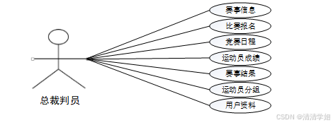 总裁判员主要是对赛事信息、比赛报名、竞赛日程、运动员成绩、赛事结果、运动员分组、用户资料等功能等操作。总裁判员用例分析图,如图3-3所示。