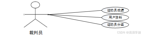 裁判员主要有个人账号和密码进行更新管理,对运动员成绩、运动员分组、用户资料等功能操作。裁判员用例分析图,如图3-2所示。