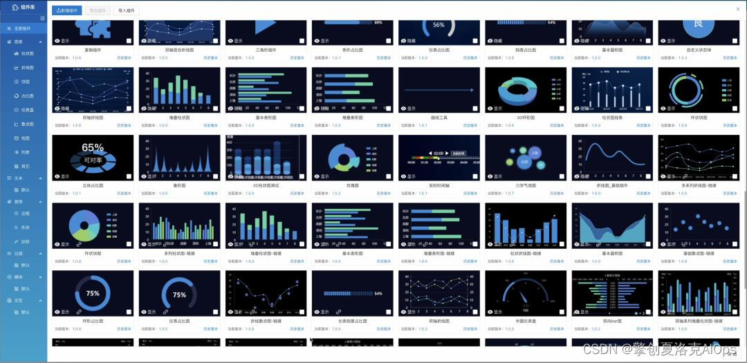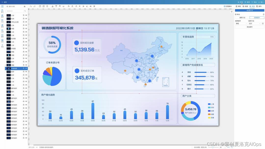 ①预置了大量精致的可视化组件,用户可自由进行搭配组合,只需通过简单的拖拉拽即可创造出专业的可视化页面。