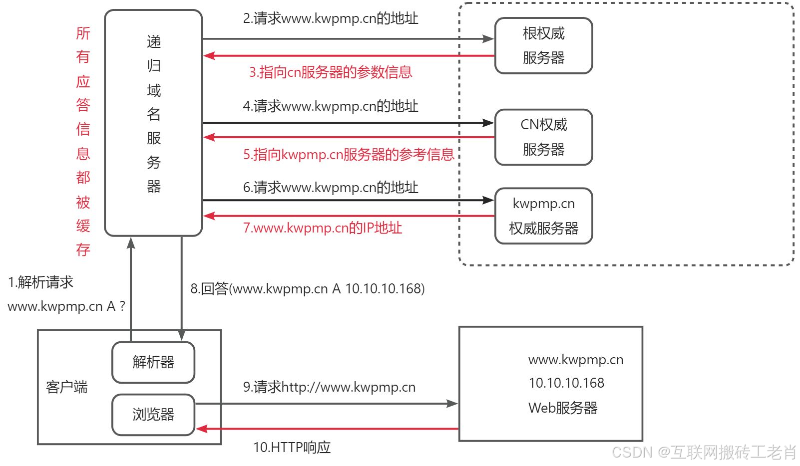 - 权威 DNS 服务器:本地 DNS 服务器向权威 DNS 服务器查询该域名对应的 IP 地址,权威 DNS 服务器将 IP 地址返回给本地 DNS 服务器。