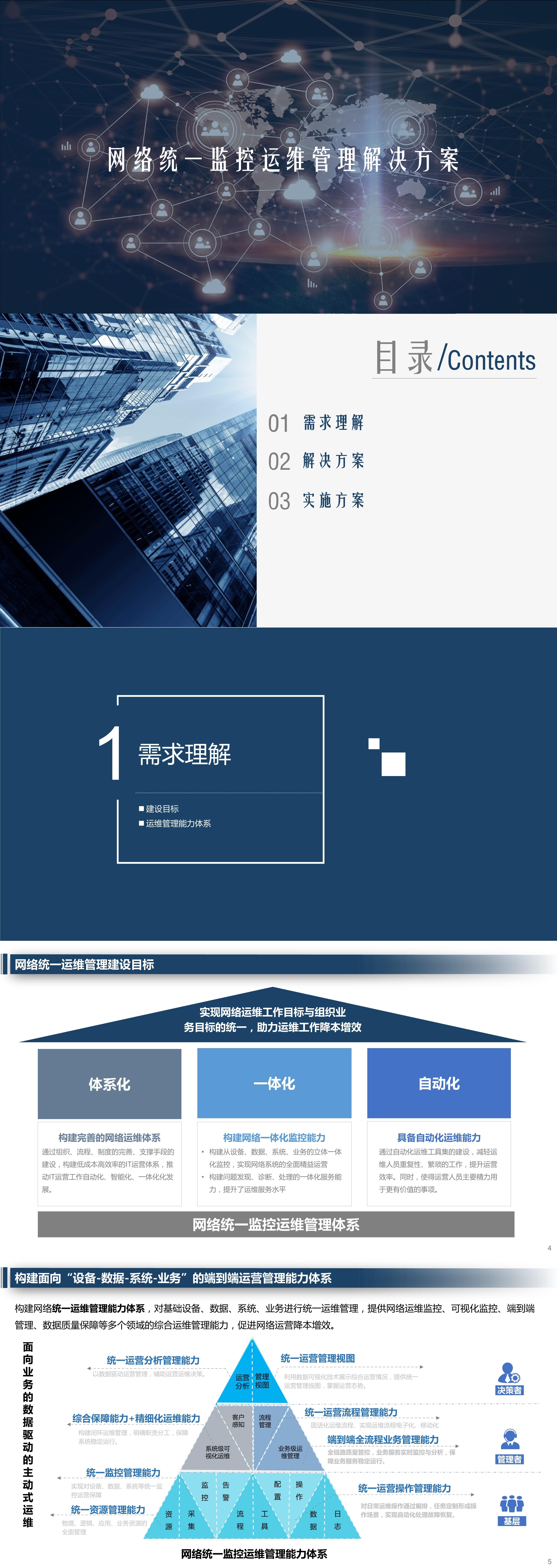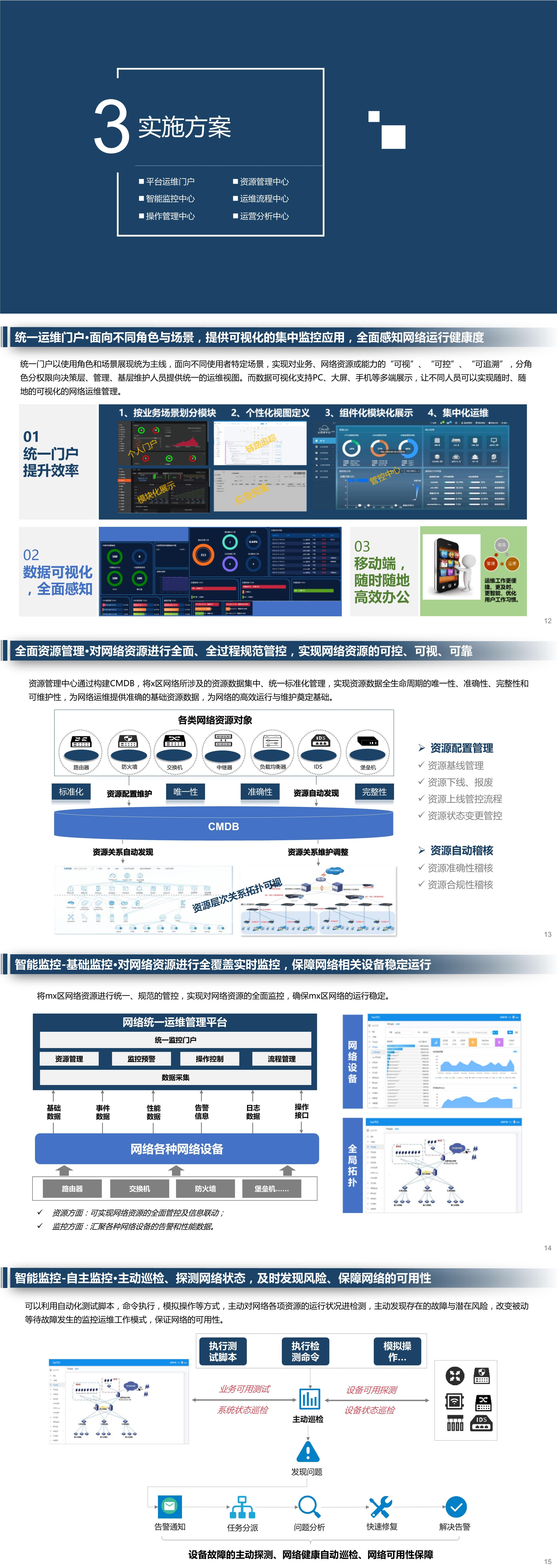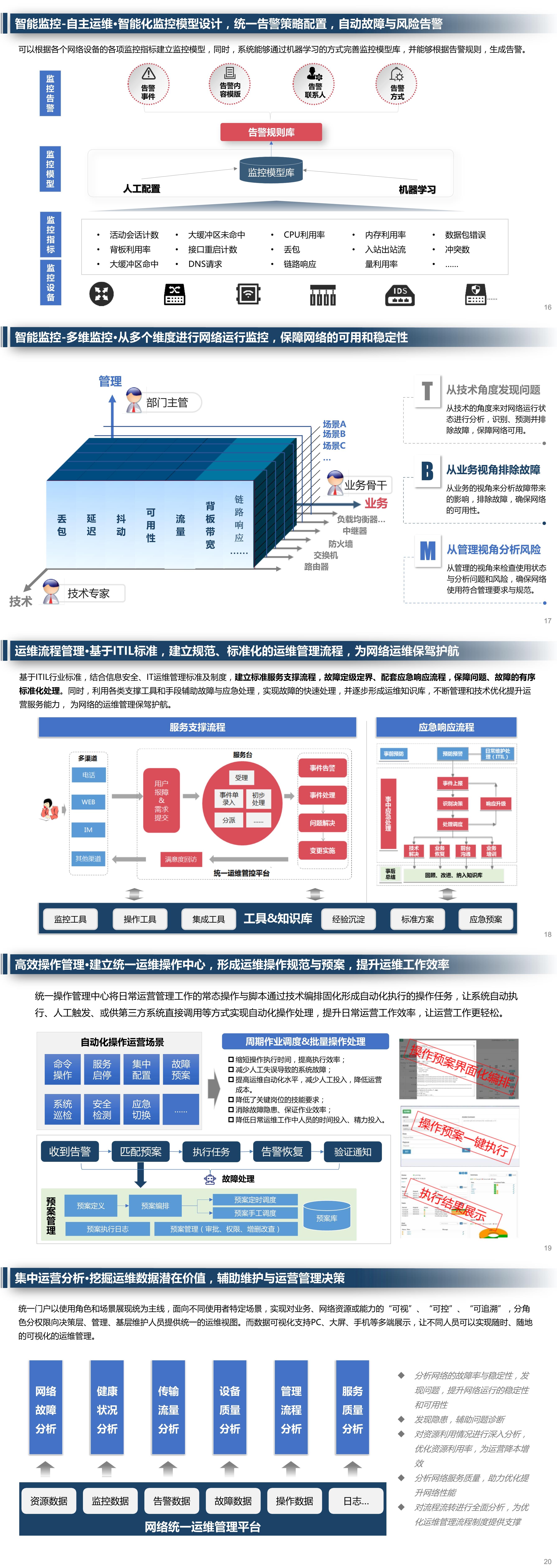 构建网络统一运维管理能力体系,对基础设备、数据、系统、业务进行统一运维管理,提供网络运维监控、可视化监控、端到端管理、数据质量保障等多个领域的综合运维管理能力,促进网络运营降本增效。