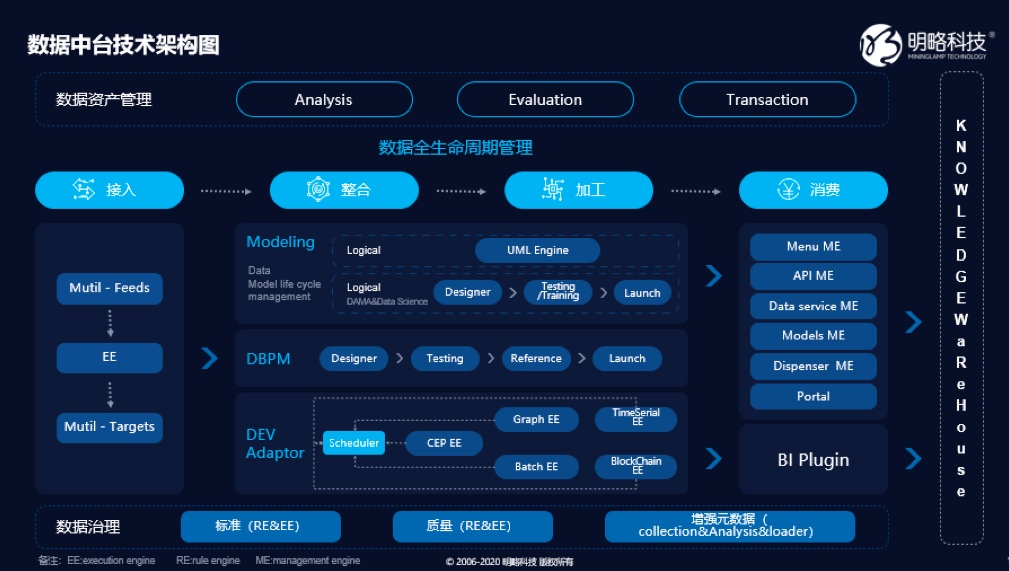 总体来看,明略科技数据中台架构的底层接入了多元异构的数据源,通过数据标准化、数据质量管理、数据安全、增强元数据、运维管理体系等完成数据资产常规的运营管理。在此之上通过增强数据操作系统,解决数据中台价值的发挥和开发。数据全生命周期作为一种管理体系,对数据的接入、整合、加工、消费等进行全生命周期的管理。之上的数据资产运营平台,从运营的维度对数据资产做综合分析,包括数据资产分析、数据资产图谱、数据资产交易等管理体系。