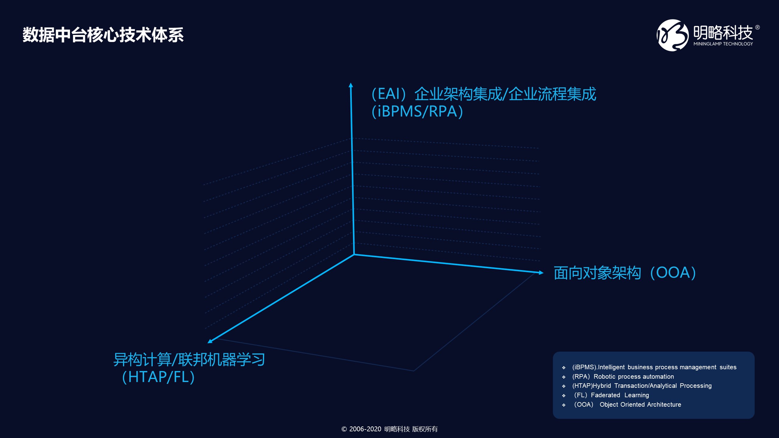 一年过后,明略科技数据中台负责人刘国栋将明略科技的数据中台实践总结为数据中台的核心技术体系,具有三大维度:第一个维度是EAI企业应用集成/企业流程集成(iBPMS/RPA),第二个维度是异构计算/联邦机器学习(HATP/FL),第三个维度是面向对象架构(OOA)。刘国栋强调,数据中台技术体系是一套很经典的信息工程管理体系,已经存在了很长时间,只不过在每个阶段的表现形式不一样。