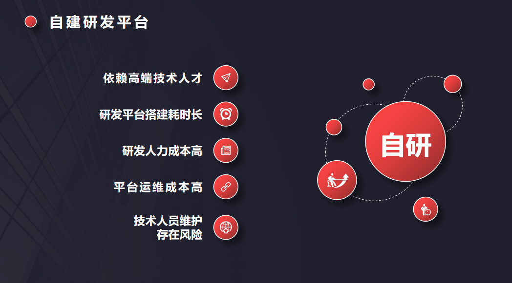 2014年,开始自建研发平台,使用各类开源技术进行搭建,前后端研发平台、移动平台、大数据平台、AI平台、各类中台建设(技术中台,应用中台,数据中台等)但也出现了运维成本过高、搭建耗时长等各种弊端。