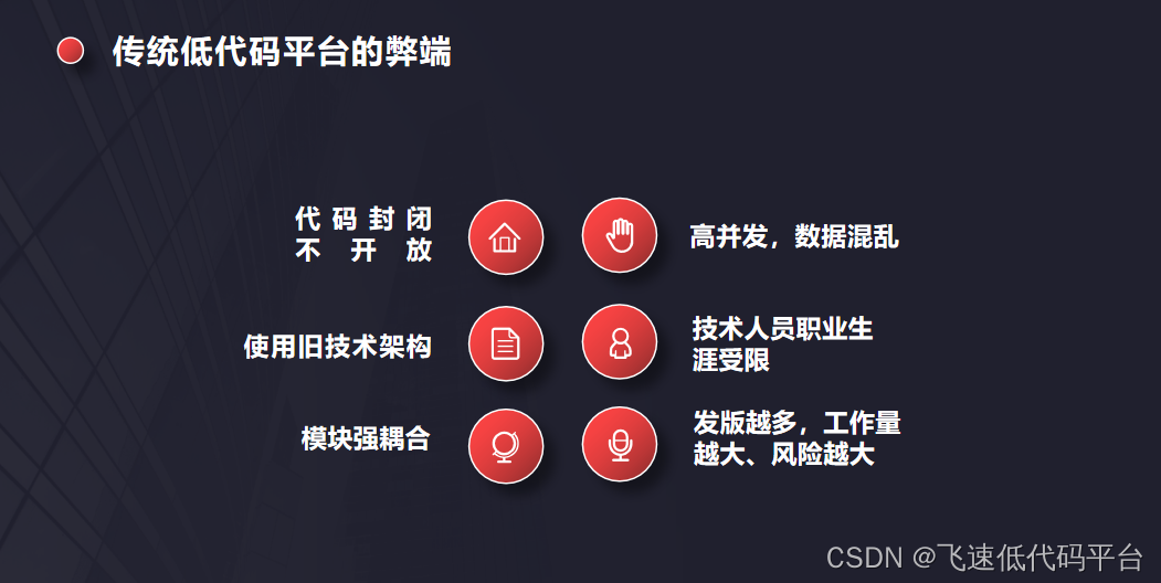 2013年采用过传统低代码平台,不是微服务模式,版本迭代需要全量进行测试,测试压力随着项目的增加而增加,数据量增大后,容易数据混乱。
