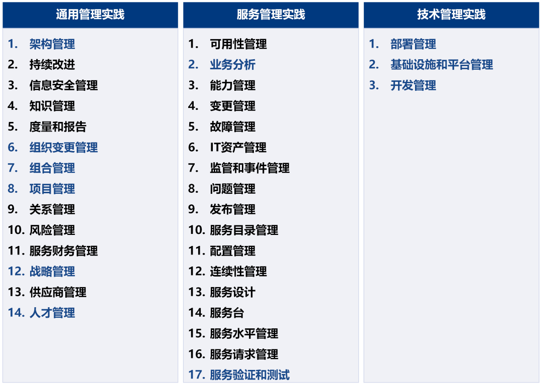 管理知识是通用的,但通用的知识更需要在整体融会贯通之后,才能用于数据中心数字化转型中,本小节重点介绍一下通用管理实践中“标注蓝色”的内容。