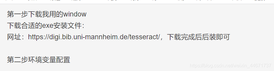 下载leptonica 和 tesseract两个包,解压安装,配置环境变量即可。网上很容易找到该安装包。