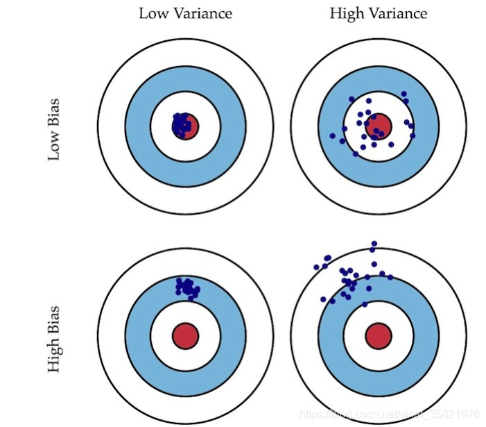 偏差:描述模型输出结果的期望与样本真实结果的差距,高偏差类似与欠拟合,通过增加特征数量,减小正则化项实现