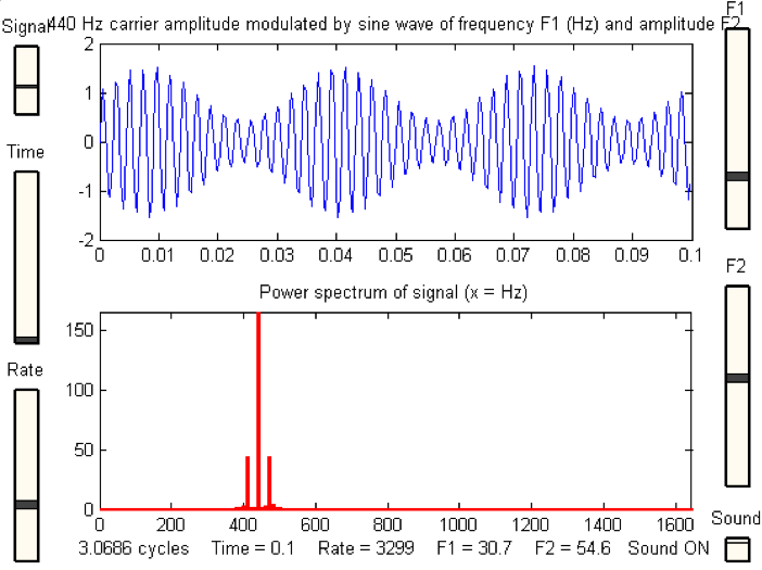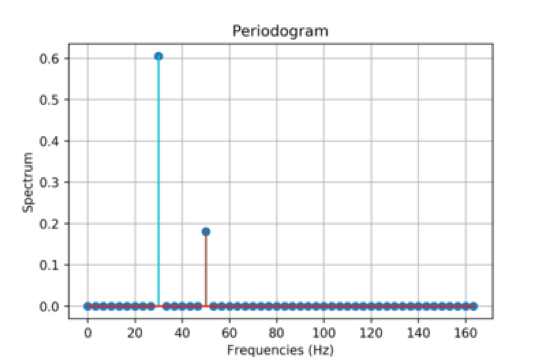 在信号处理中, 周期图是信号频谱密度的估计值。 上面的周期图显示了〜30Hz和〜50Hz的两个正弦基函数的功率谱。 可以将傅立叶变换的输出实质上(不是完全)视为周期图。