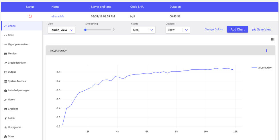 甚至在培训尚未完成之前,Comet都会跟踪有关我们实验的关键信息。 我们可以从Comet UI实时看到我们的准确性和损失曲线(请注意,橙色的旋转轮表示正在进行训练)。
