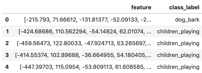 现在,我们有了一个数据框,其中每行都有一个标签(类)和一个要素列,由40个MFCC组成。