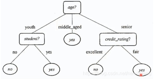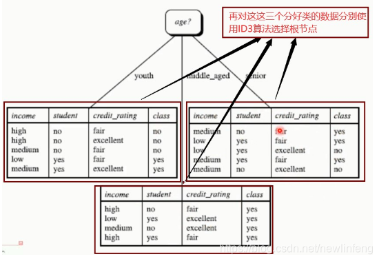 (1) 把信息增益最大的那个作为根节点,如下图,age的信息增益最大,为0.246,即age为根节点。
