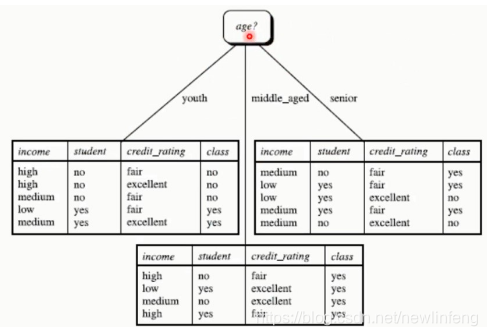 (2) ID3算法比较倾向选择分支数(属性值)比较多的那个参数(下面图中age是三个属性值,而students、credit-rating、income都只有两个属性值)