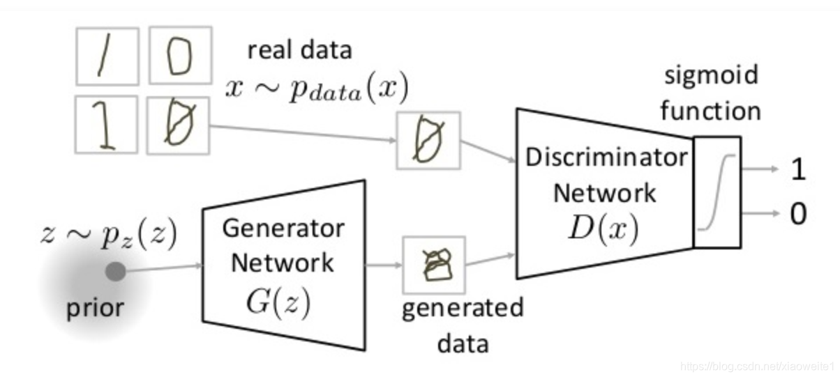 - 判别器(Discriminator),用来判别图片是真的还是假的,输入图片(训练的数据或者生成的数据),输出为判别图片的标签