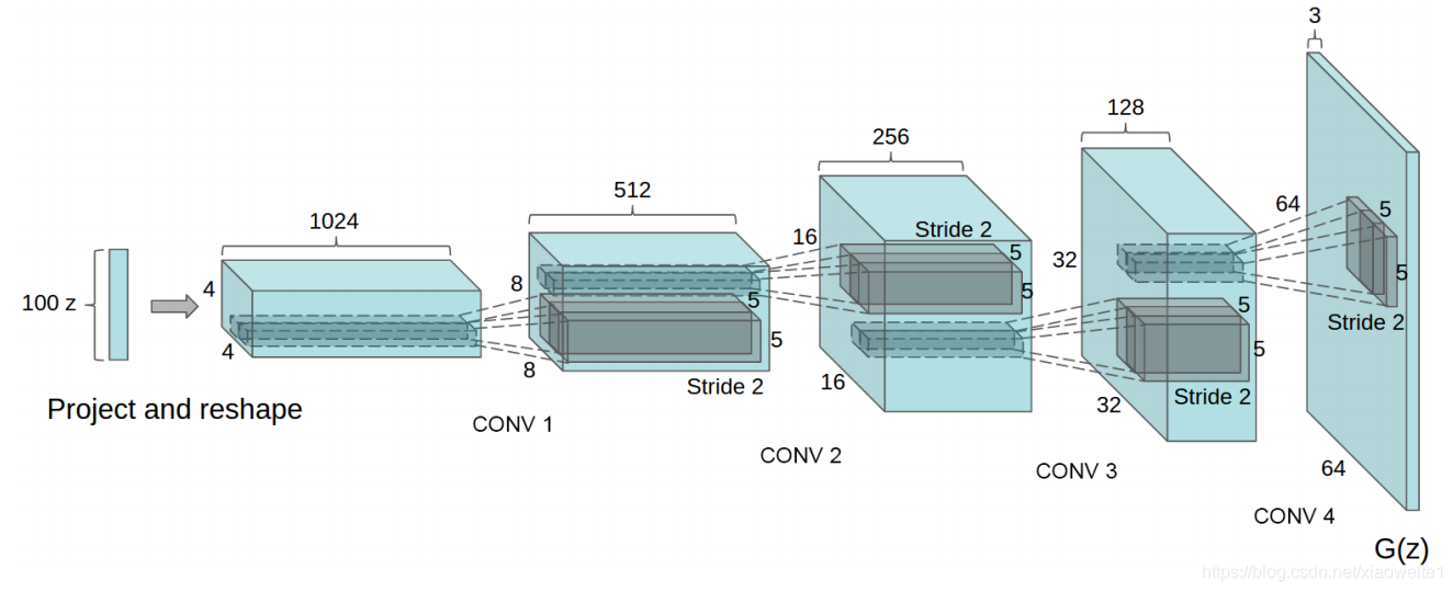 - 1、判别器D中取出pooling,全部变成卷积、生成器G中使用反卷积(下图)