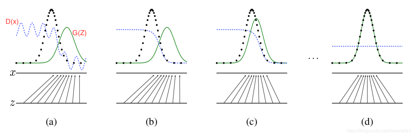 - (a)(a)状态处于最初始的状态,生成器生成的分布和真实分布区别较大,并且判别器判别出样本的概率不稳定