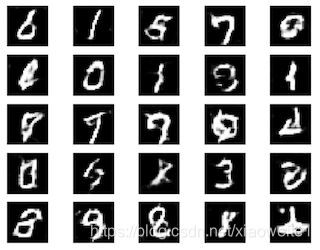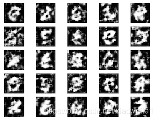 print("迭代次数:%d [D 损失: %f, 准确率: %.2f%], [G 损失: %f]" % (epoch, d_loss[0], 100 * d_loss[1], g_loss))