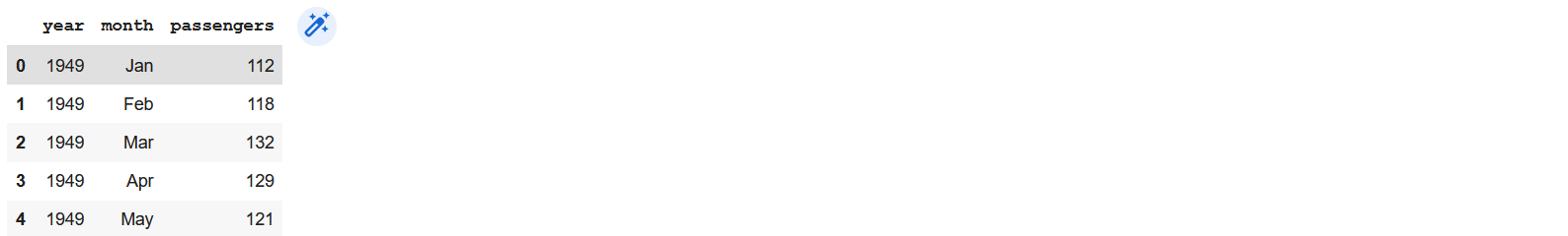 对于这项任务,让我们使用 seaborn 数据集库中的简单"航班"数据集。我们将使用以下命令加载数据集。
