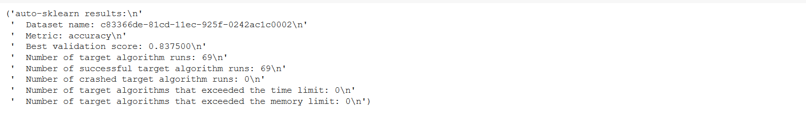 说明一下,在这里我们使用time_left_for_this_task参数设置此任务的最长时间,并为其分配5分钟。如果没有为此参数指定任何内容,则该过程将运行一个小时,即60分钟。使用per_run_time_limit参数将分配给每个模型评估的时间设置为 30 秒。