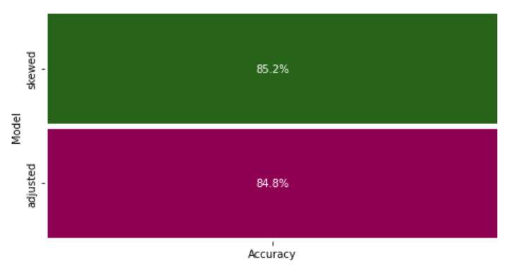 model_eval = pd.DataFrame({'Model': ['skewed','adjusted'], 'Accuracy': [m1_acc_score,m2_acc_score]})