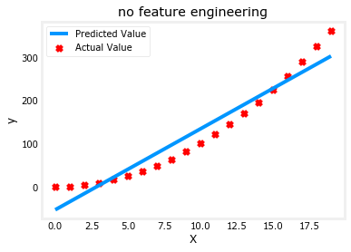 plt.scatter(x, y, marker='x', c='r', label="Actual Value"); plt.title("no feature engineering")