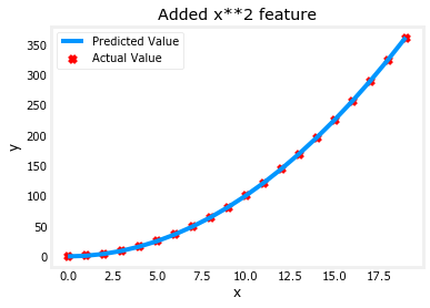 plt.scatter(x, y, marker='x', c='r', label="Actual Value"); plt.title("Added x**2 feature")