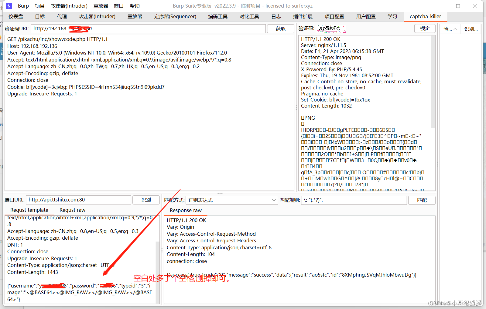 请求包,username,password处去http://ttshitu.com注册账号,该平台识别500次一元钱:
