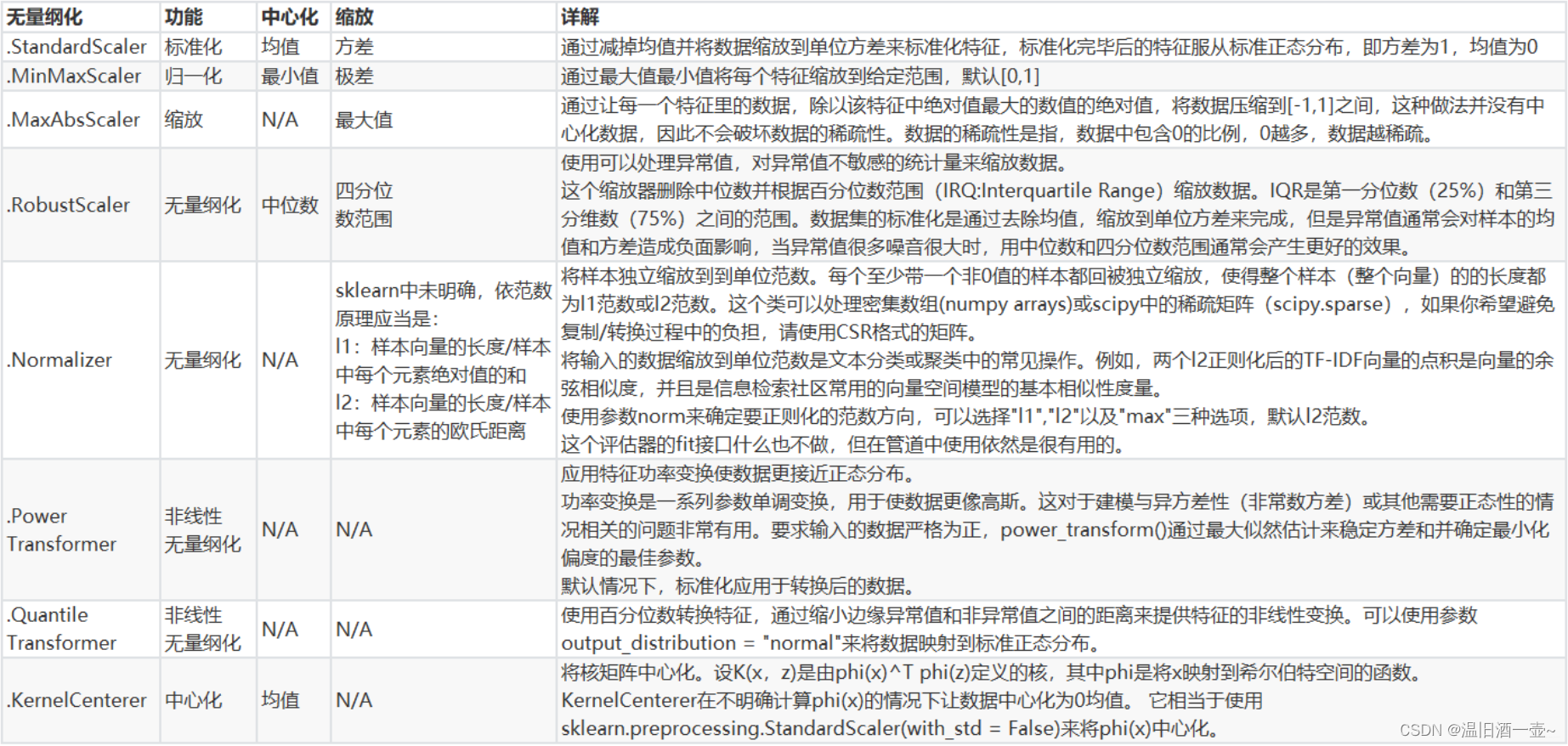 除了StandardScaler和MinMaxScaler之外,sklearn中也提供了各种其他缩放处理(中心化只需要一个pandas广播一下减去某个数就好了,因此sklearn不提供任何中心化功能)