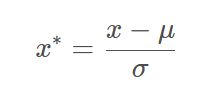 数据标准化(Standardization,又称Z-score normalization):当数据(x)按均值(μ)中心化后,再按标准差(σ)缩放,数据就会服从为均值为0,方差为1的正态分布(即标准正态分布),公式如下: