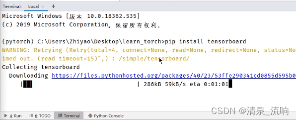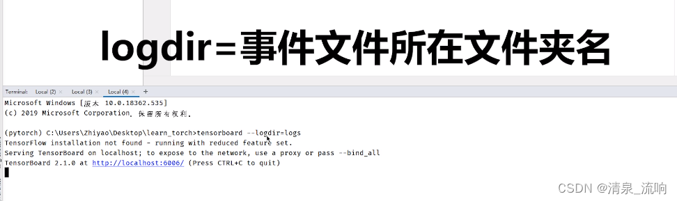 在pycharm编译平台下面选择terminal,输入tensorboard --logdir=logs,如下图所示