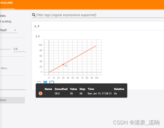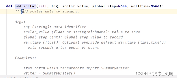 add_scalar的用法:参数1、tag是图表的标题,参数2、scalar_value是需要保存的数值,对应于坐标轴的纵轴,参数3、global_step对应于坐标轴的横轴