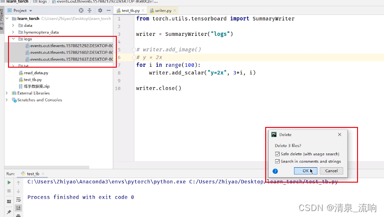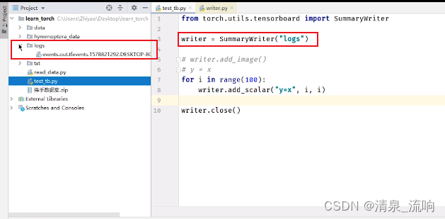 writer=SummaryWriter("logs")表示将对应的事件存储到logs文件夹下面