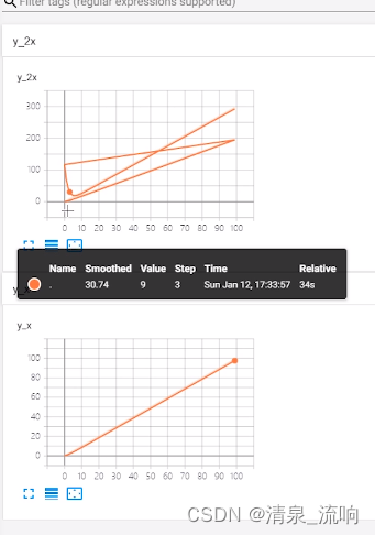遇到的问题,连续运行两次不同的数据,不修改add_scalar的参数tag图表的标题,会出现下面情况,上一个事件与当前事件冲突了