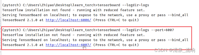 更实用的输入指令是指定端口,输入tensorboard --logdir=logs --port=6007,可以避免与其他人的端口一样,从而避免冲突,如下图所示