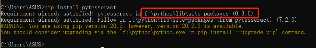 然后通过cmd输入pip install pytesseract可以看到自己安装的pytesseract所在路径