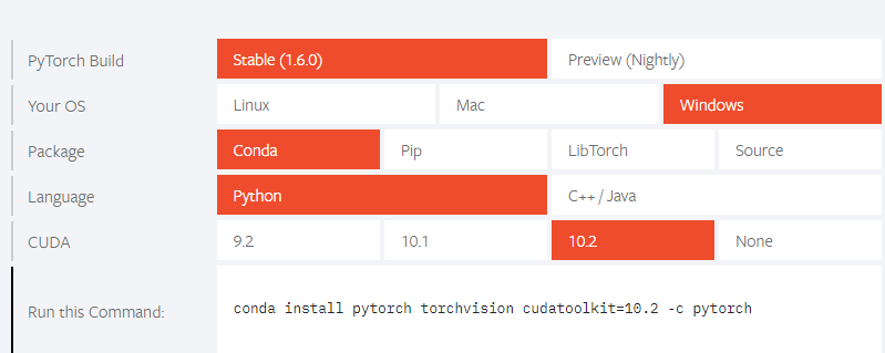 完了把pytorch配置的的安装命令拷贝进去就可以安装pytorch。输入以下代码验证:
