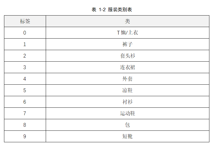 数据集还包括了一个服装类型的标签数组,数组的每个值介于0~9之间,这些标签对应于图像所代表的服装类。如表1-2所示。