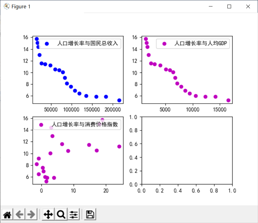 从散点图可以看出,人口增长率与国民总收入、人均GDP呈现较好地线性关系,人口增长率与消费价格指数线性关系较弱,在本案例中,可以认为它们具有一定的线性关系。