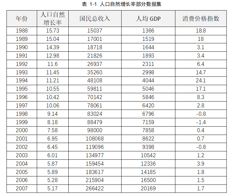 下表是国民总收入、人均GDP和居民消费价格指数及人口自然增长率部分数据集。