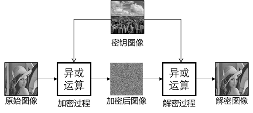采用数值加密、解密的逻辑,即可得到图像加密、解密的逻辑,图像加密解密模型如图2所示。其中,密钥图像是加密、解密双方约定的任意一幅图像(本例中使用的是一幅城市风景图)。解密后得到的解密图像与原始图像完全一致。