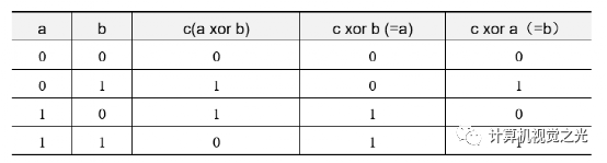本文讨论异或的加密。异或加密运算如表1所示(使用xor表示异或运算),针对数字0和数字1,其运算规律为: