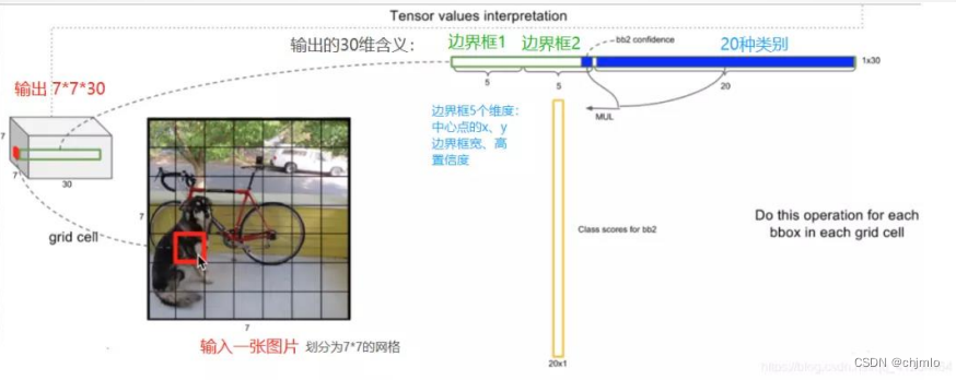 YOLO v1在PASCAL VOC数据集上进行的训练,因此输入图片为 448 × 448 × 3。实际中如为其它尺寸,需要resize或切割成 要求尺寸。输出结果为 个7 × 7 × 30的张量,对应 7 × 7个cell。每个cell对应2个包围框(bounding box, bb),预测不同大小和宽高比, 对应检测不同目标。每个bb有5个分量, 分别是物体的中心位置(𝑥, 𝑦)和它的高 (ℎ) 和宽 (𝑤) ,以及这次预测的置信度。