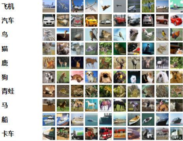 CIFAR-10数据集由10个类的60000个32x32彩色图像组成,每 个类有6000个图像。有50000个训练图像和10000个测试图像,数据集分为五个训练批次和一个测试批次,每个批次有10000 个图像。测试批次包含来自每个类别的恰好1000个随机选择的图像。以下是数据集中的类,以及来自每个类的10个随机图像: