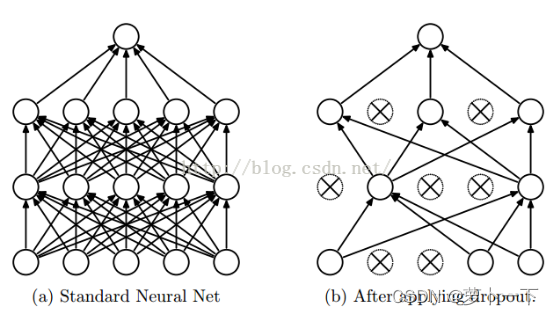 其次,可以在训练过程中随机失活部分神经元(参数)--某些参数不参与训练--减少训练参数,如下图所示。