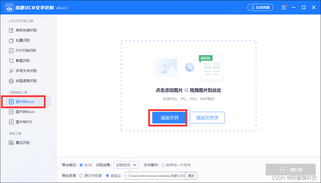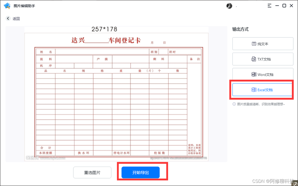 第二步 上传好图片文件之后,接下来点击选择输出的格式为Excel,选择完成之后,点击“开始导出”即可进行转换。