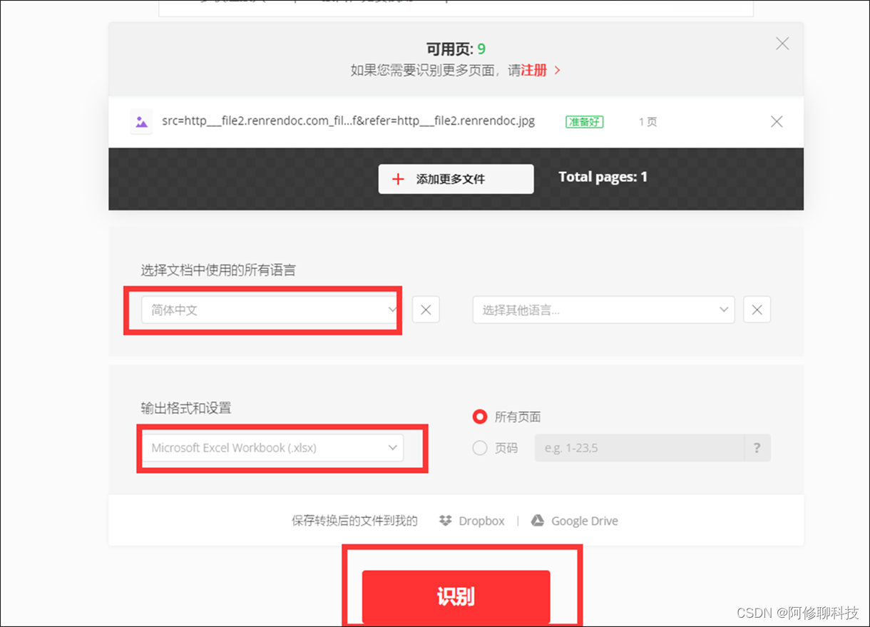 第二步 上传好图片文件之后,接下来往下滑动点击选择“识别语言”“输出格式和设置”,设置好这些之后,点击下方的“识别”按钮即可。