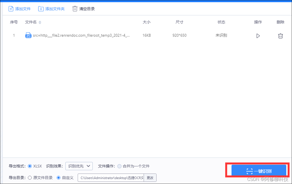第二步 上传好图片之后,接下来选择好“导出格式”“识别效果”“文件操作”等,选择完成之后,点击“一键识别”即可。