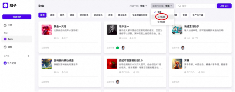 大家可以选择 公开的配置,查看扣子平台上所有公开的配置来学习各种 Agent 的提示词。