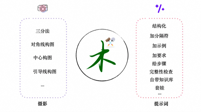 就像拍照一样,关键原则和技巧就那几个,知道和不知道、学过和没学过的人拍出的照片差异非常大。提示词亦是如此。